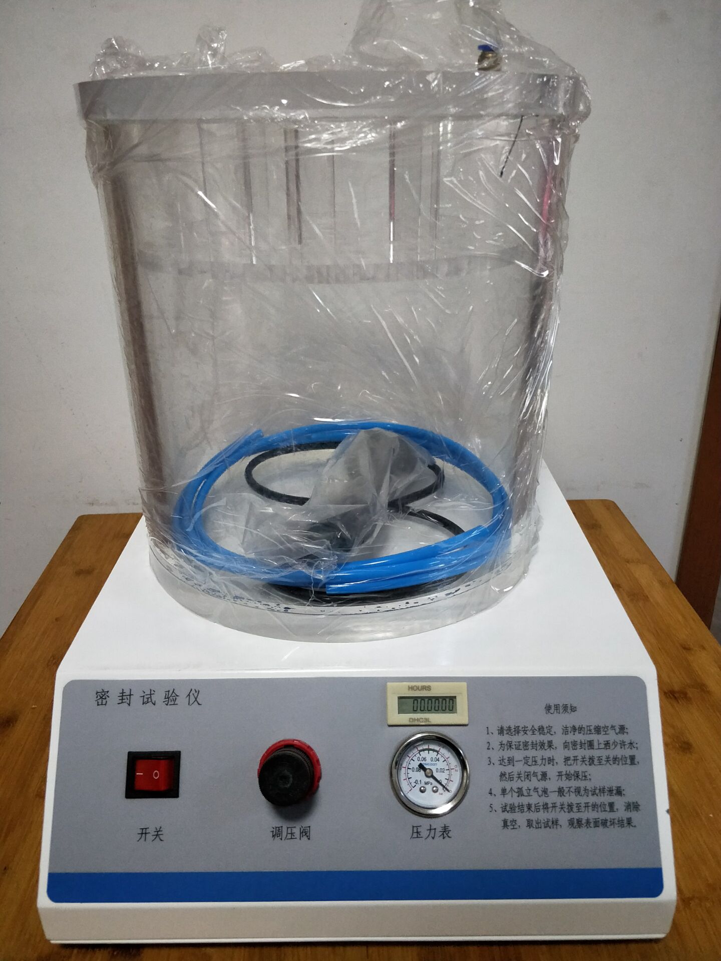 通過對真空室抽真空,使浸在水中的試樣產(chǎn)生內(nèi)外壓差,觀測試樣內(nèi)氣體外逸情況,以此判定試樣的密封性能;通過對真空室抽真空,使試樣產(chǎn)生內(nèi)外壓差,觀測試樣膨脹及釋放真空后試樣形狀恢復(fù)情況,以此判定試樣的密封性能。