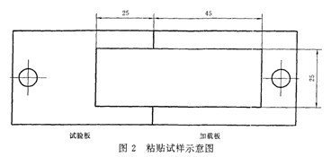 2.5 在溫度23℃±2℃,相對(duì)濕度65%±5%的條件下,按圖2規(guī)定的尺寸,將試樣平行于板的縱向粘貼在緊挨著的試驗(yàn)板和加載板的中部。用壓輥以約300 mm/min的速度在試樣上滾壓。注意滾壓時(shí),只能用產(chǎn)生于壓輥質(zhì)量的力,施加于試樣上。滾壓的次數(shù)可根據(jù)具體產(chǎn)品情況加以規(guī)定,如無規(guī)定,則往復(fù)滾壓三次。