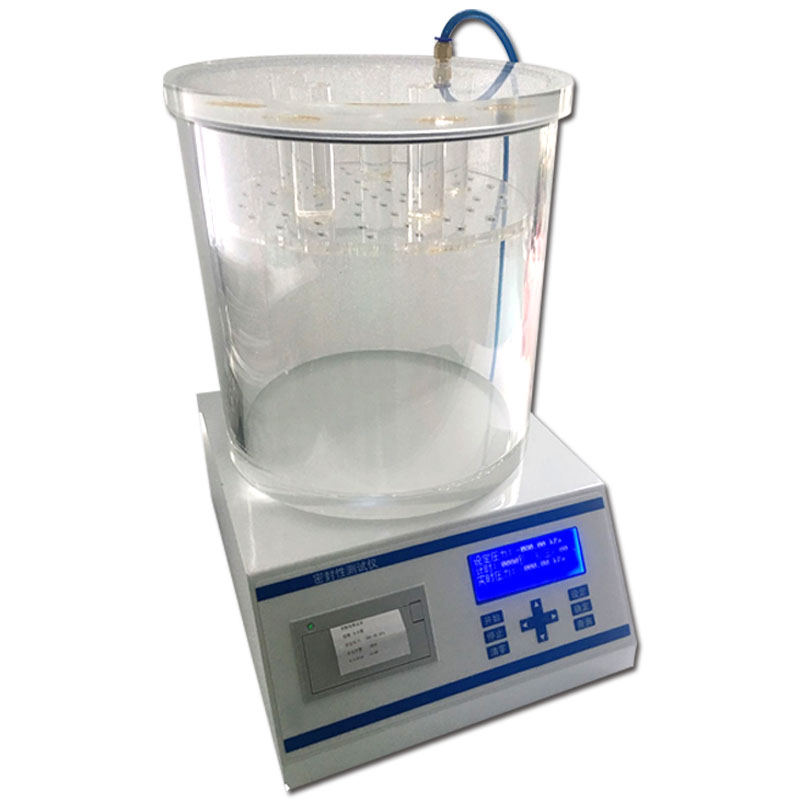 通過對真空室抽真空,使浸在水中的試樣產(chǎn)生內(nèi)外壓差,觀測試樣內(nèi)氣體外逸情況,以此判定試樣的密封性能;通過對真空室抽真空,使試樣產(chǎn)生內(nèi)外壓差,觀測試樣膨脹及釋放真空后試樣形狀恢復情況,以此判定試樣的密封性能。
